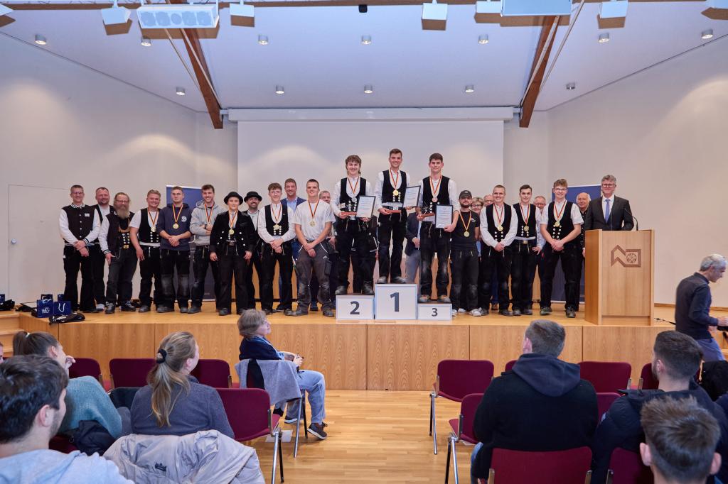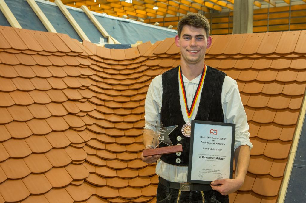 Mayen/Köln, 12. November 2025 // Nach einem spannenden Wettkampf wurden am 11. November die drei Bundessieger der Deutschen Meisterschaft „German Craft Skills“ im Dachdeckerhandwerk 2025 ermittelt. Eine Landessiegerin und 12 Landessieger kamen am 10. und 11. November in Mayen zusammen und meisterten dort vielfältige Aufgaben in den Bereichen Dachdeckung, Abdichtung und Fassade, darunter eine Kür- und zwei Pflichtaufgaben. Austragungsort und Gastgeber war das Bundesbildungszentrum des Deutschen Dachdeckerhandwerks (BBZ). Zur feierlichen Siegerehrung – moderiert vom Vorsitzenden der Bundesbewertungskommission Andreas Schmitz – kamen rund 200 Besucher und Besucherinnen.
