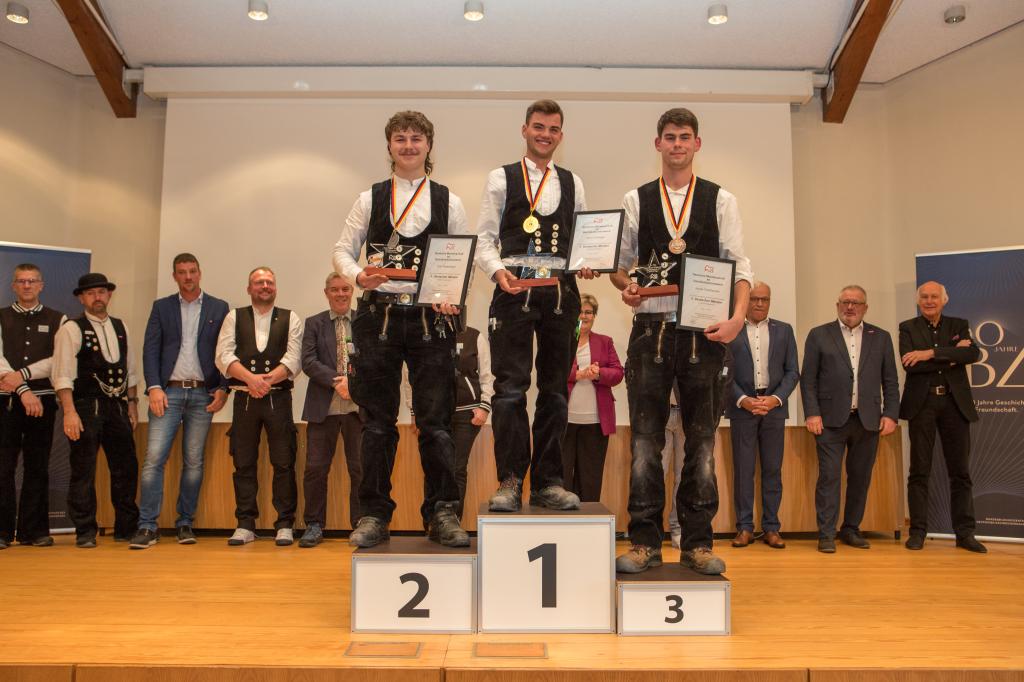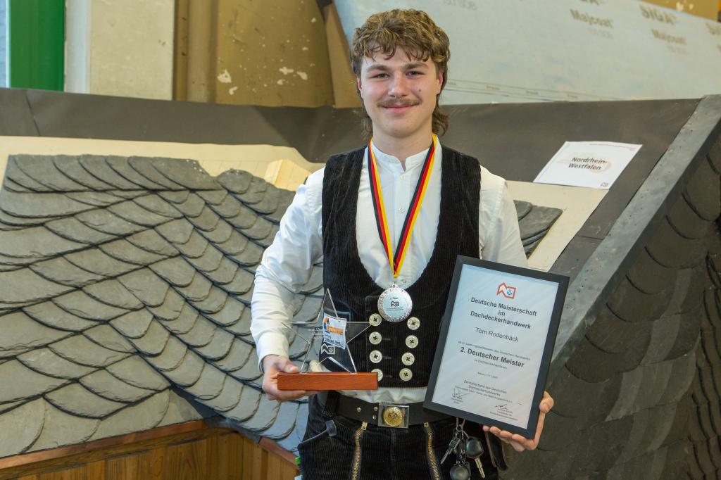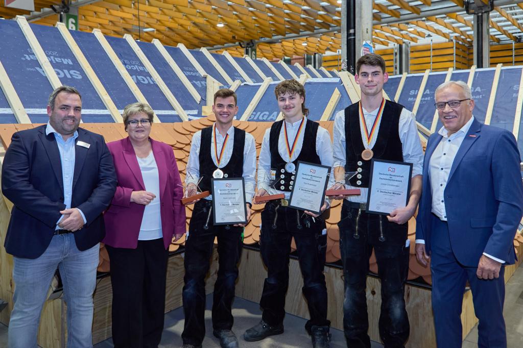 Staatssekretärin Bettina Brück aus dem Ministerium für Bildung Rheinland-Pfalz, zeigte sich sehr angetan von den Fertigkeiten der jungen Leute und von ihrer Begeisterung für das Dachdeckerhandwerk: „Sie gehören zu den Besten ihres Berufs in ganz Deutschland, das ist eine großartige Leistung!“ Sie hob auch die enge Zusammenarbeit aller Beteiligten in Rheinland-Pfalz hervor: „Die Berufsschulen, die Ausbildungsbetriebe, die überbetrieblichen Ausbildungsstätten, das BBZ, die Handwerkskammern: Sie alle arbeiten Hand in Hand und zeigen, wie stark das duale System ist.“ Kurt Krautscheid, Präsident der Koblenzer Handwerkskammer, zeigte sich angetan von den seit Jahren steigenden Ausbildungszahlen im Dachdeckerhandwerk und dass 2025 ein Höchsttand erreicht worden sei. Auch er lobte die Leidenschaft der Teilnehmenden und wünschte ihnen noch „viele glückliche und inspirierende Momente auf dem weiteren Weg im Dachdeckerhandwerk.“ Johannes Lauer, Landesinnungsmeister des Landesverbands Rheinland-Pfalz, nannte die Landessieger „das Aushängeschild des Ausbildungsstandes des Deutschen Dachdeckerhandwerks“ und würdigte die tolle Leistung jedes Einzelnen. Mayens Bürgermeister Bernhard Mauel rief den jungen Menschen zu, das Beste aus der noch vor ihnen liegenden Zeit zu machen: „Die Rahmenbedingungen im Dachdeckerhand-werk sind wunderbar.“ Einhellig gab es ein großes Lob für die Bundesbewertungskommission, die mit viel Sorgfalt und Umsicht die Bewertungen der gefertigten Arbeiten vorgenommen habe. Dies sei bei der durchweg hohen Qualität kein leichter Job, den sie aber Bravour bewältigt hätte.
